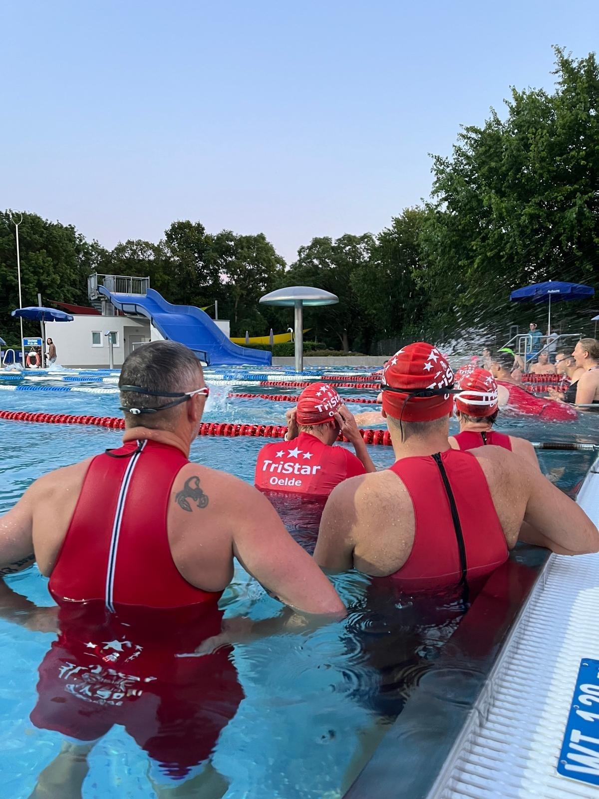 Das Format: fünf Athleten pro Team, die Zeit des vierten zählt. Für TriStar Oelde standen Tim Zarges, Matthias Gravendyk, Mathias Amtoft, Ben Althoff und Lennard Langerbein an der Startlinie. Geschwommen wurde im 50m Becken des Nordbads , bei leider nicht optimalen „Deutschen Wetter“: nass, kühl und durchgehend Regen.